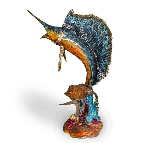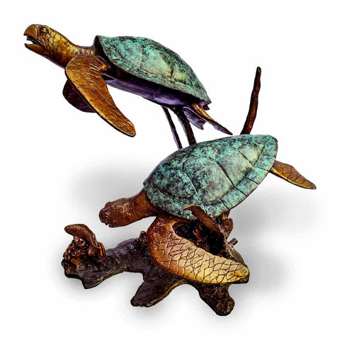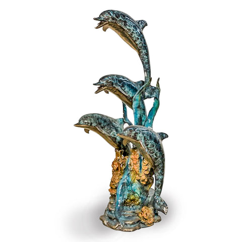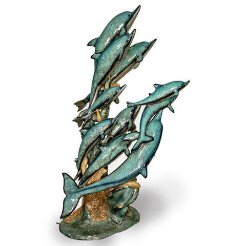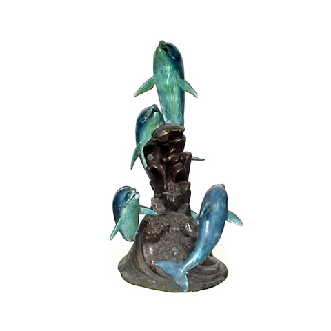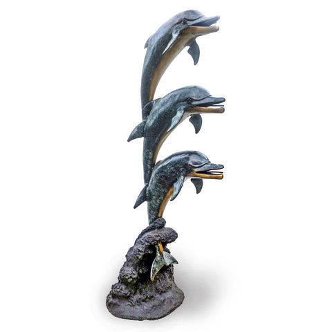 A lost-wax bronze dolphin fountain features two dolphins intricately designed to appear as though they are leaping from the water. The two dolphins are positioned one above the other, creating a dynamic and graceful vertical composition. Each dolphin statue is detailed with realistic features, capturing the sleekness of their bodies and the playful curve of their fins. The water for the fountain feature is designed to flow from the dolphins' mouths, cascading down to the base, which resembles a rocky ocean floor.