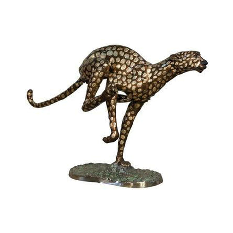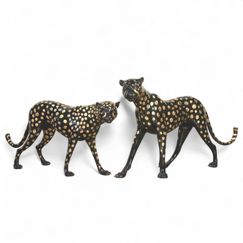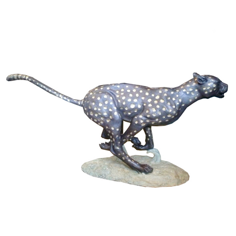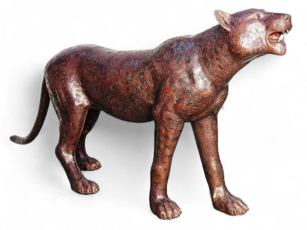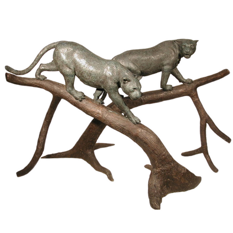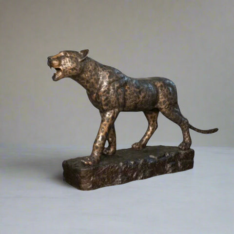 A lost-wax bronze jaguar statue on a bronze rock base that captures the powerful essence and grace of the infamous wildcat. Casted using the time-honored lost-wax technique, every detail in the roaring jaguar is expertly capture from the jaguar’s muscular frame & poised stance, to the strong & intimidating face. The jaguar statue is finished with hand-applied textured spots and positioned on the free-form textured rock base.
