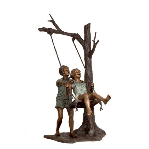 A lost-wax bronze children's statue of two boys climbing a mountain of rocks together. As the two friends or brothers play on the textured rock base, one child reaches down to help the other young boy up the rock mountain. This bronze sculpture can also be tubed to add a lifelike children's bronze fountain to parks, gardens, schools, playgrounds or camps.