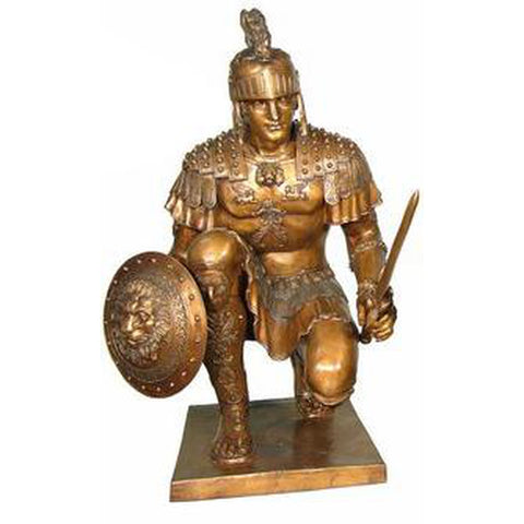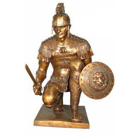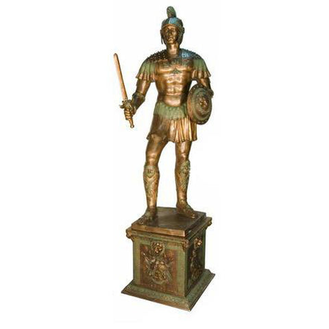 On the base, images cast in bronze depict the soldier vanquishing his enemies and seizing the day. Together, the Roman soldier bronze mascot statue and base measure: 34" x 29" x 89"H.
