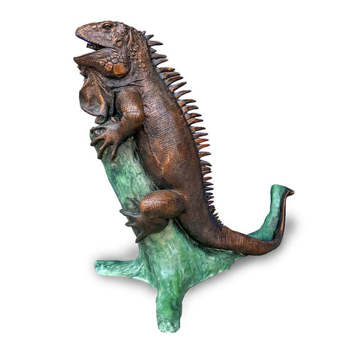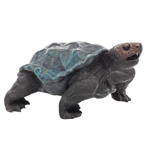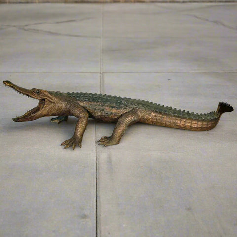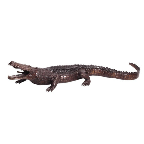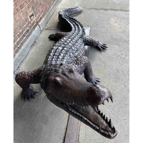 A lost-wax life-size bronze alligator statue with scales meticulously designed to mimic the natural texture of alligator skin - creating a lifelike representation of this infamous reptile. The bronze alligator statue is featured sitting with its body turned as it opens its mouth, showing the animal's characteristic sharp teeth.